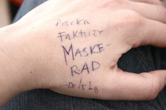 Jag skriver på handen för att komma ihåg. Idag står det: Packa, fakturor, maskerad och Delsbo. Jag kan ju inte skriva vad jag ska säga och hur jag ska åka, för då hade jag gjort det. Inte vet jag vad jag gjort heller.
