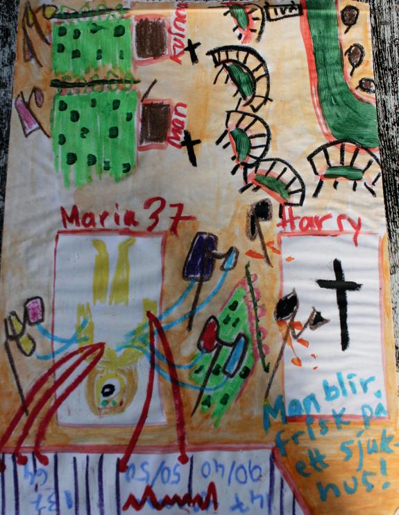 Det pumpar och drar i själen. Ibland är det ljust. Jag vill mot ljuset. Ibland är det ett bord. Jag ligger naken på bordet. Man skär i mig. Jag gissar att jag är död. Jag hostar och gråter inombords. Ingen ska få se mina tårar. Jag är stark. Jag har ont. Knivar och saxar överallt. Polis P fortsätter kasta knivar på mig fast jag ligger ner.