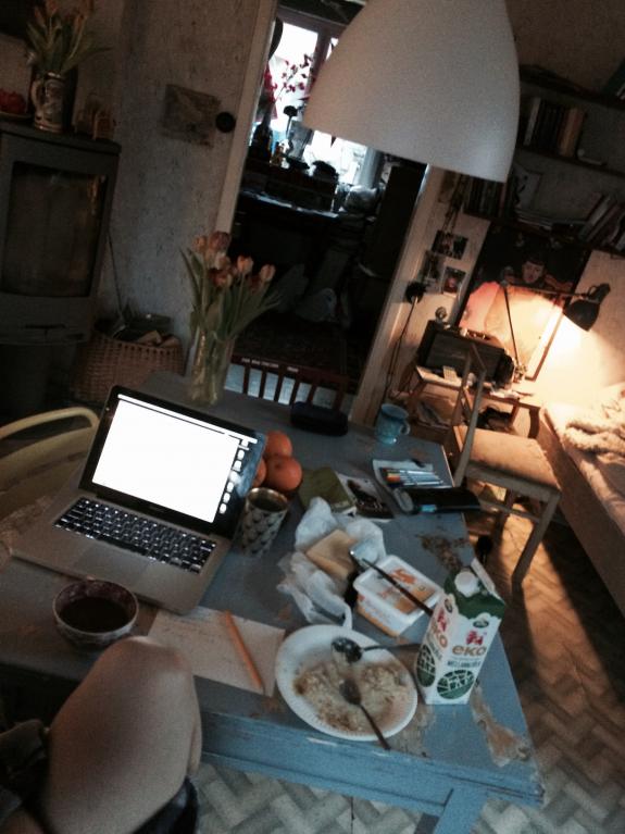 Frukost. Gammal mjölk, gammalt bröd och nykokt gröt.