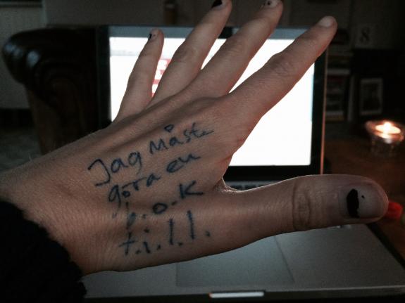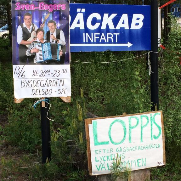 det har blivit grönt ute, inte vet jag hur det gick till, det är ju juni, när det nu hände, saker pågår hela tiden, sakerna frågar inte ens om lov, inte ens livet undrar varför, grönt är det, blå är sjön, eller, nej, grå, jag borde skriva för tidningen, för livet, för tiden, för rymden, för att utan träden så skulle ju luften ta slut, och husen man bygger är så fula, inredningen ser ut som allting annat, hur gick det till när det gick till att det skulle inredas som i Stockholm, för i Stockholm är allting rätt, vilken tur att ni bor där, inte här, i Delsbo, och museet är tråkigt och jag är naken, fast under kläderna, jag kanske har tröttnat på andras konst, jag borde bara göra själv, min bok, en salig blandning, eller bara lakrits bilder, det känns ju alltid som om jag inte kan, men visst kan jag, men jag gråter och jag vill bara ha kommatecken överallt, det, har, hakat, upp, sig, som ibland när man sätter upp skyltar i Delsbo